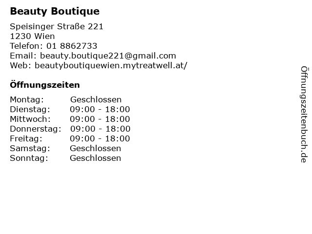 | Öffnungszeiten Beauty Boutique in Wien anzeigen | |