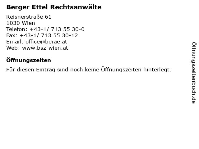 | Öffnungszeiten Berger Ettel Rechtsanwälte in Wien anzeigen | |