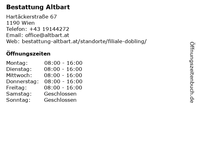 | Öffnungszeiten Bestattung Altbart in Wien anzeigen | |