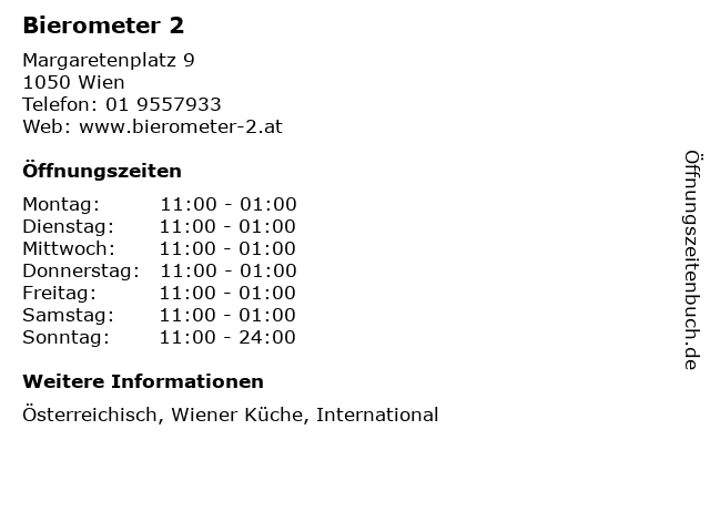 | Öffnungszeiten Bierometer 2 in Wien anzeigen | |