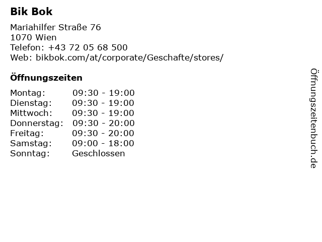 | Öffnungszeiten Bik Bok in Wien anzeigen | |