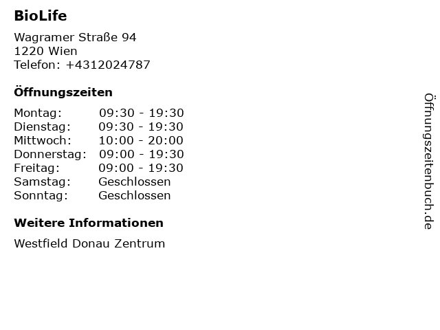 | Öffnungszeiten BioLife in Wien anzeigen | |