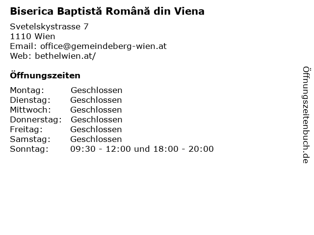| Öffnungszeiten Biserica Baptistă Română din Viena in Wien anzeigen | |