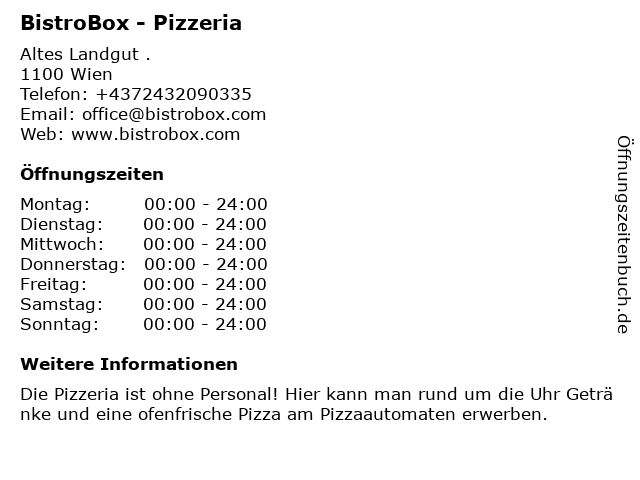 | Öffnungszeiten BistroBox - Pizzeria in Wien anzeigen | |