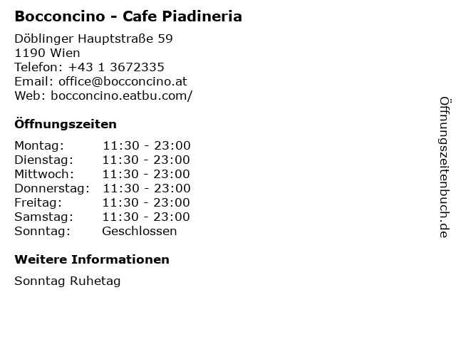 | Öffnungszeiten Bocconcino - Cafe Piadineria in Wien anzeigen | |
