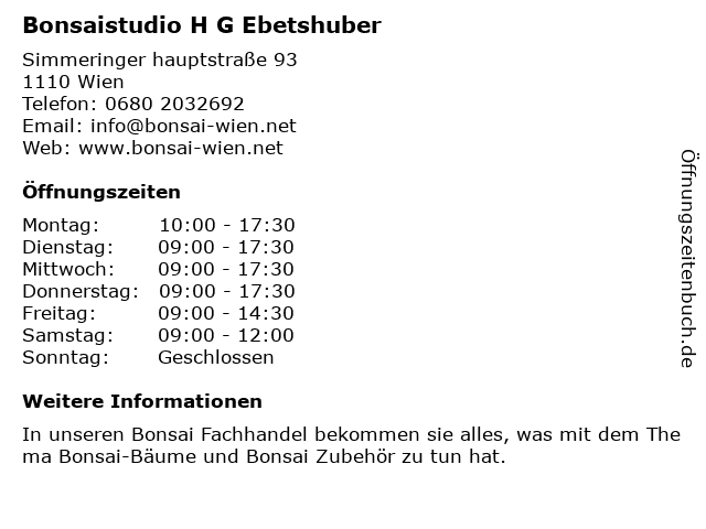 | Öffnungszeiten Bonsaistudio H G Ebetshuber in Wien anzeigen | |