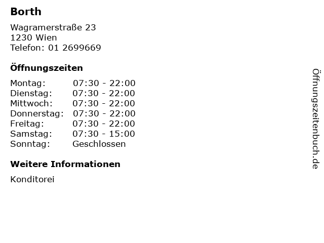 | Öffnungszeiten Borth in Wien anzeigen | |