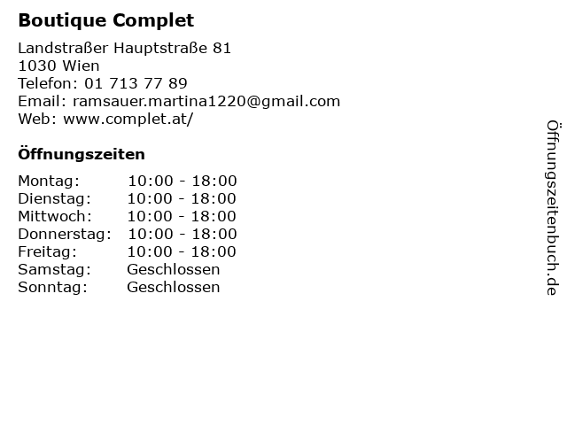 | Öffnungszeiten Boutique Complet in Wien anzeigen | |