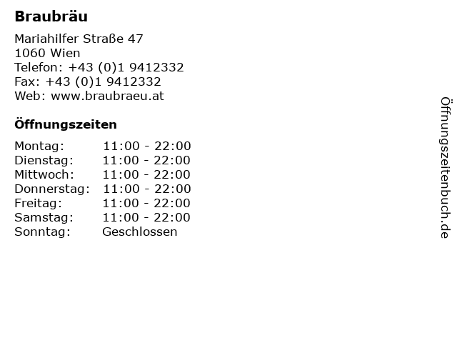 | Öffnungszeiten Braubräu in Wien anzeigen | |