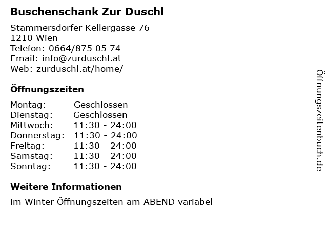 | Öffnungszeiten Buschenschank Zur Duschl in Wien anzeigen | |