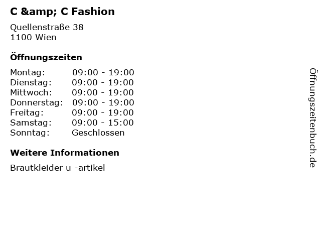 | Öffnungszeiten C & C Fashion in Wien anzeigen | |