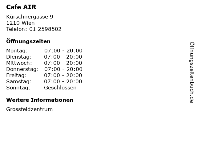 | Öffnungszeiten Cafe AIR in Wien anzeigen | |