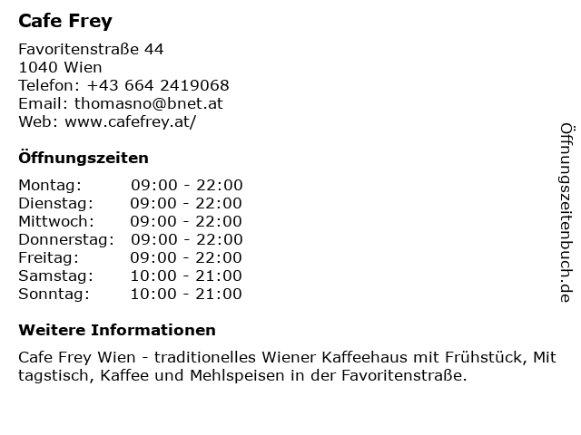 | Öffnungszeiten Cafe Frey in Wien anzeigen | |