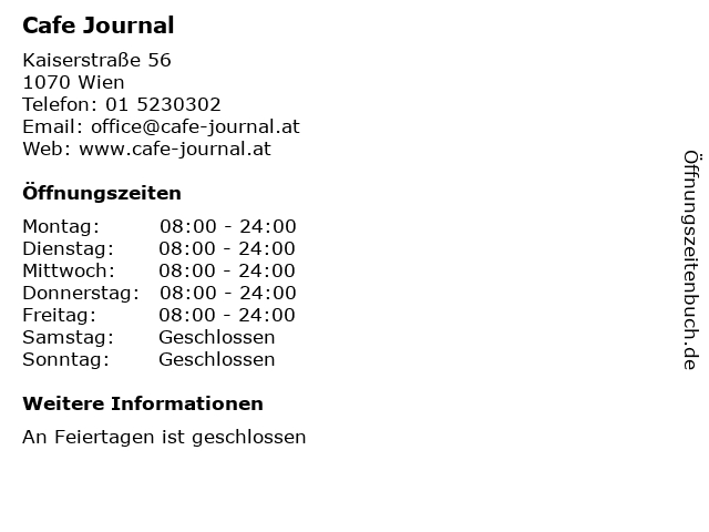 | Öffnungszeiten Cafe Journal in Wien anzeigen | |