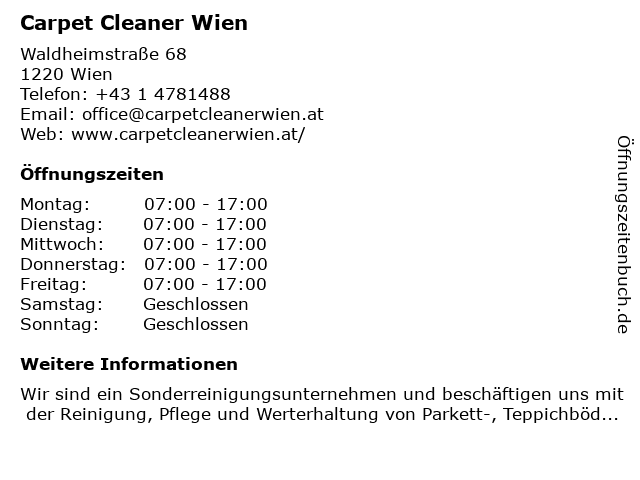 | Öffnungszeiten Carpet Cleaner Wien in Wien anzeigen | |
