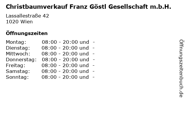 | Öffnungszeiten Christbaumverkauf Franz Göstl Gesellschaft m.b.H. in Wien anzeigen | |