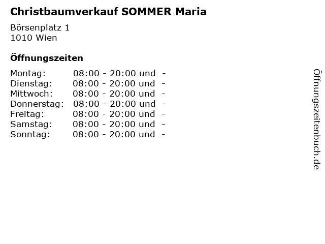 | Öffnungszeiten Christbaumverkauf SOMMER Maria in Wien anzeigen | |