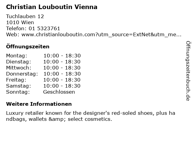| Öffnungszeiten Christian Louboutin Vienna in Wien anzeigen | |