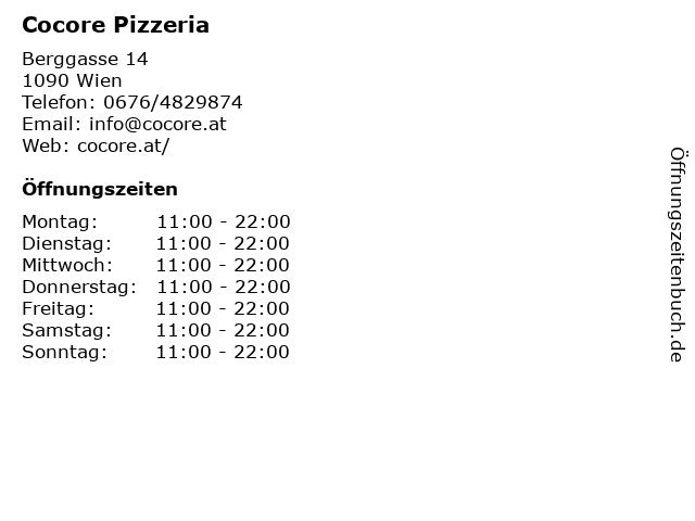 | Öffnungszeiten Cocore Pizzeria in Wien anzeigen | |