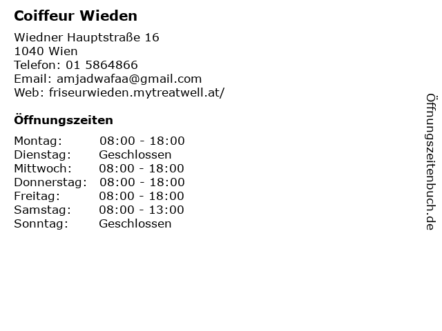 | Öffnungszeiten Coiffeur Wieden in Wien anzeigen | |