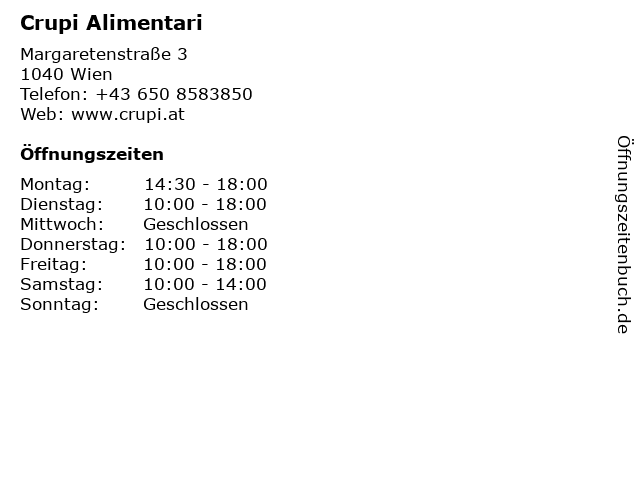 | Öffnungszeiten Crupi Alimentari in Wien anzeigen | |