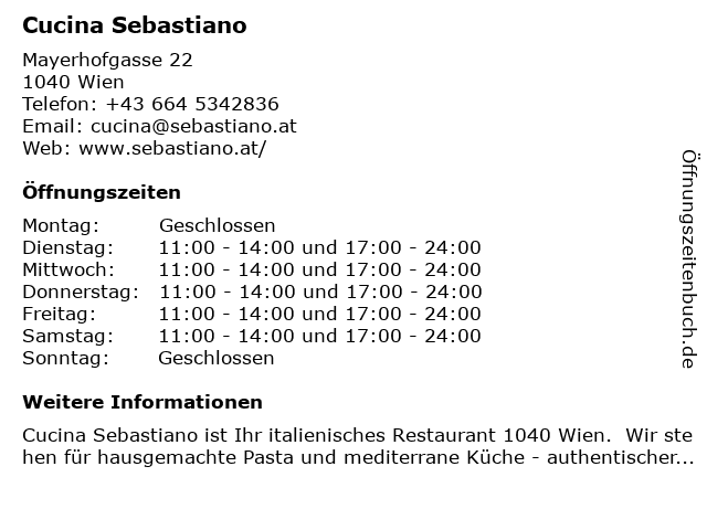 Cucina Sebastiano in Wien | Telefonnummer, Öffnungszeiten und Adresse
