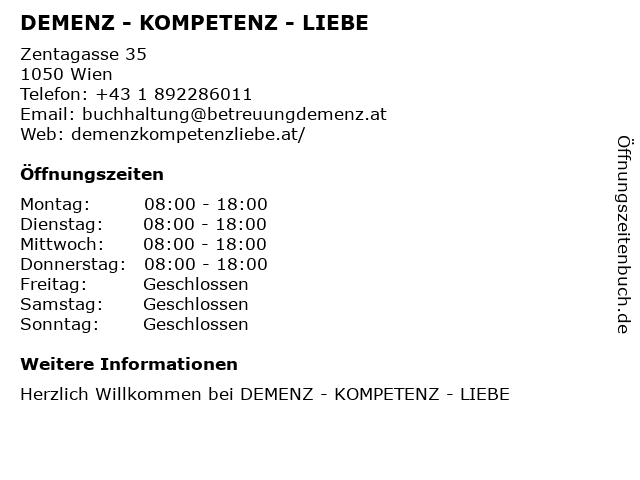 | Öffnungszeiten DEMENZ - KOMPETENZ - LIEBE in Wien anzeigen | |