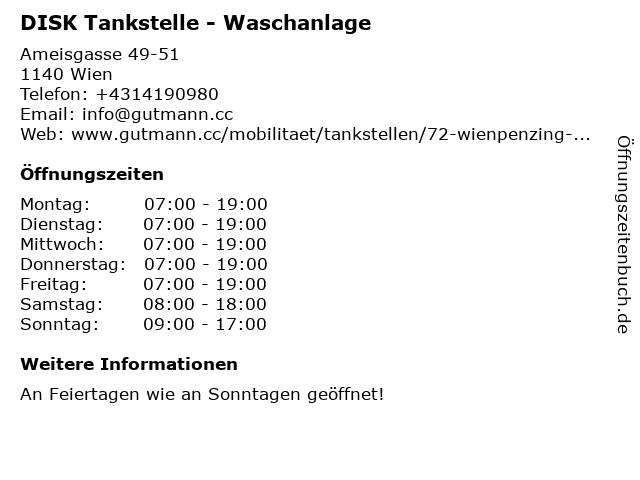 | Öffnungszeiten DISK Tankstelle - Waschanlage in Wien anzeigen | |