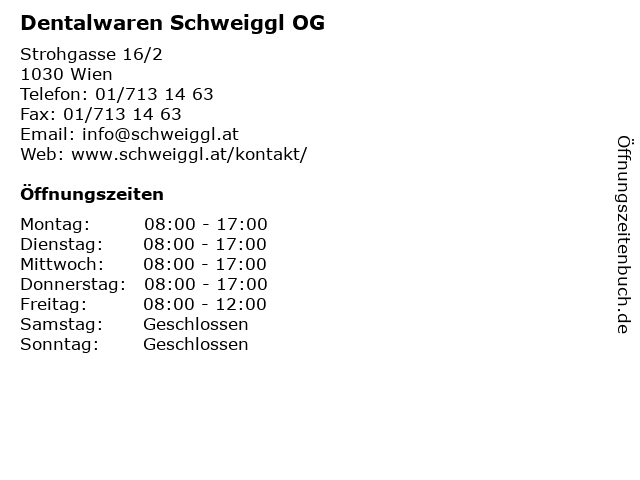 | Öffnungszeiten Dentalwaren Schweiggl OG in Wien anzeigen | |