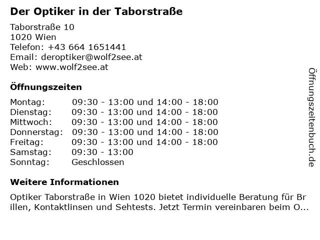 | Öffnungszeiten Der Optiker in der Taborstraße in Wien anzeigen | |