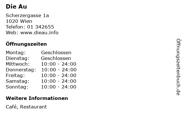 | Öffnungszeiten Die Au in Wien anzeigen | |