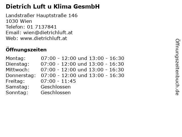 | Öffnungszeiten Dietrich Luft u Klima GesmbH in Wien anzeigen | |