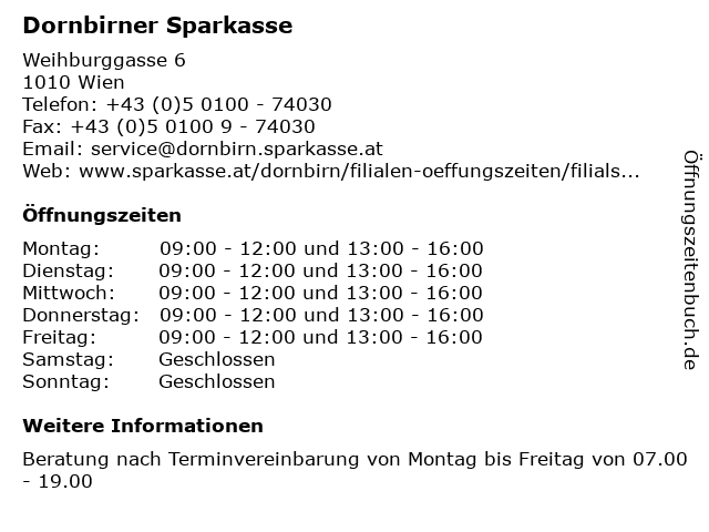 | Öffnungszeiten Dornbirner Sparkasse in Wien anzeigen | |