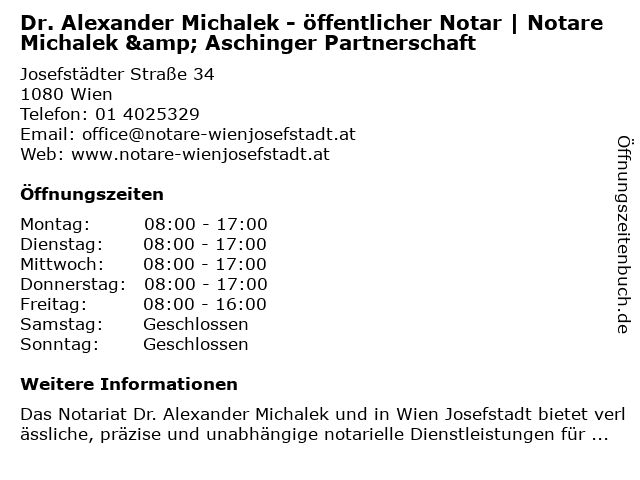 1 Öffentliche Notare Dr. Alexander Michalek & Mag. Robert Aschinger (Entfernung: 0,00 km) Josefstädter Straße 34, 1080 Wien 6 |