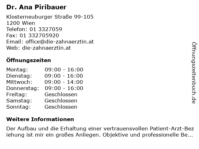 | Öffnungszeiten Dr. Ana Piribauer in Wien anzeigen | |