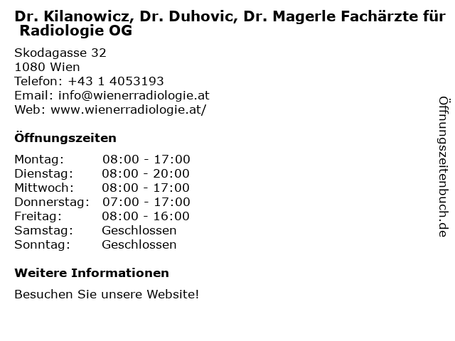 Branchen & Suchbegriffe zu Dr. Kilanowicz, Dr. Duhovic, Dr. Magerle Fachärzte für Radiologie OG:dr., duhovic, fachärzte, kilanowicz, magerle, og, radiologie |