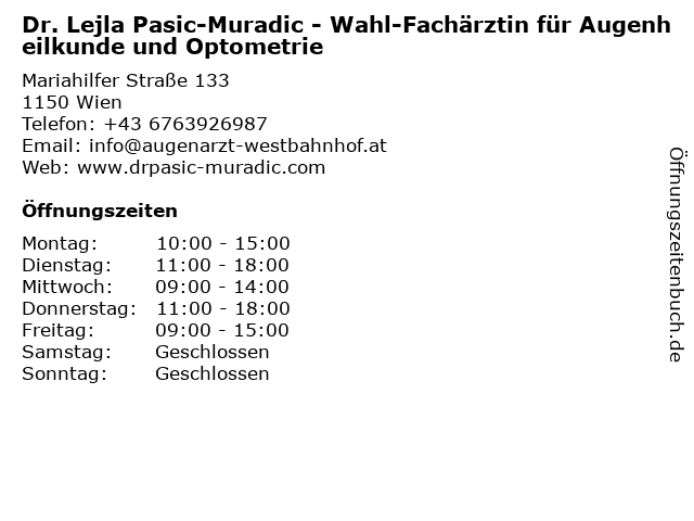 Branchen & Suchbegriffe zu Dr. Lejla Pasic-Muradic - Wahl-Fachärztin für Augenheilkunde und Optometrie:arzt, augen, augenarzt, augenheilkunde, dr., fachärztin, lejla, muradic, optik, optometrie, ordination, pasic, praxis, wahl, wahrärztin |