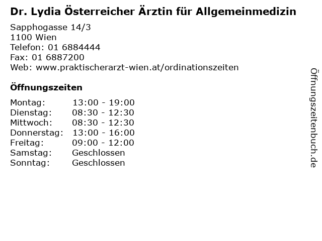 1 Dr. Claudia Frey - Ärztin für Allgemeinmedizin (Entfernung: 0,24 km) Ada-Christen-Gasse 2J / 9, 1100 Wien 2 Dr. Katharina Mraz Ärztin für Allgemeinmedizin (Entfernung: 1,40 km) Franz-Koci-Straße 2/6/3, 1100 Wien 3 5 Dr. med. univ. Khatereh Ghasemi - Ärztin für Allgemeinmedizin (Entfernung: 2,30 km) Gellertplatz 10/3, 1100 Wien 6 Dr. Beate Brenner - Ärztin für Allgemeinmedizin (Entfernung: 3,25 km) Hertha Firnberg-Strasse 7/28, 1100 Wien |