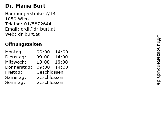 | Öffnungszeiten Dr. Maria Burt in Wien anzeigen | |