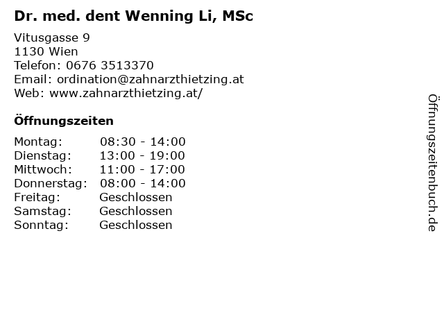 | Öffnungszeiten Dr. med. dent Wenning Li, MSc in Wien anzeigen | |
