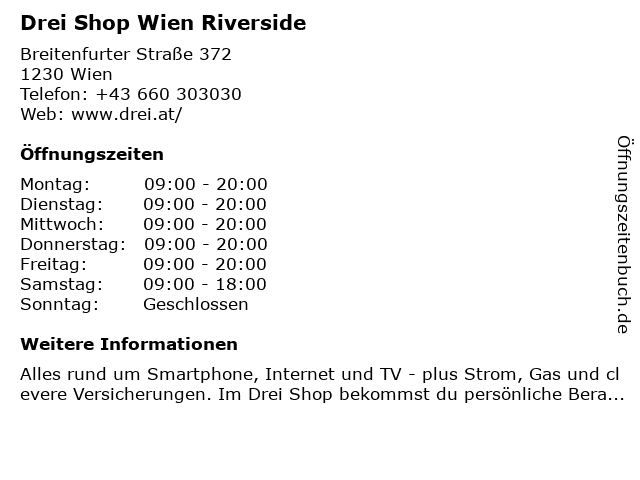 | Öffnungszeiten Drei Shop Wien Riverside in Wien anzeigen | |