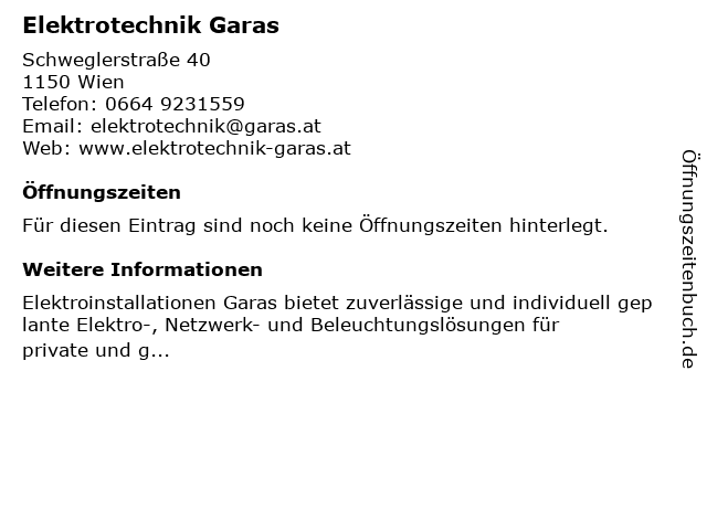 | Öffnungszeiten Elektrotechnik Garas in Wien anzeigen | |