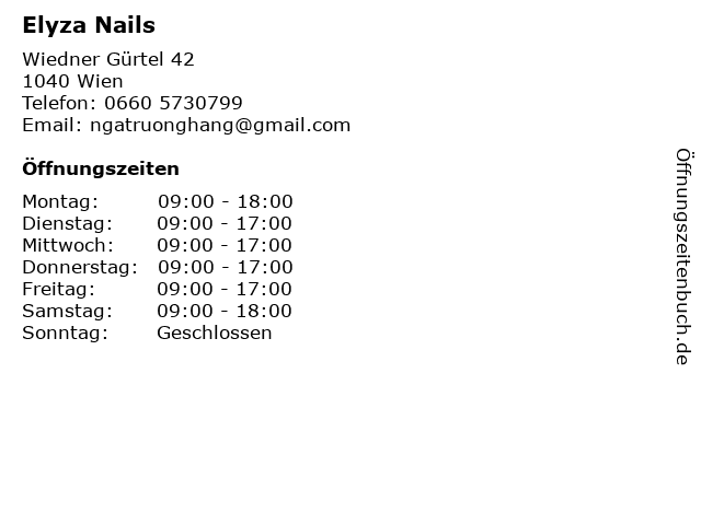 | Öffnungszeiten Elyza Nails in Wien anzeigen | |