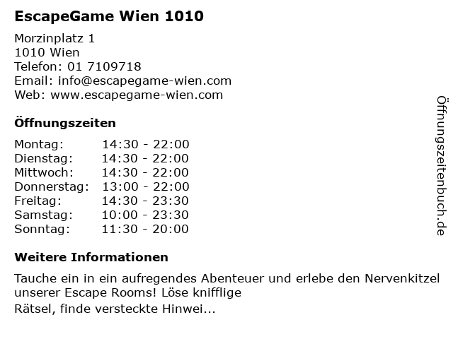 | Öffnungszeiten EscapeGame Wien 1010 in Wien anzeigen | |