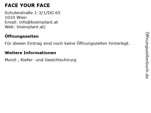 | Öffnungszeiten FACE YOUR FACE in Wien anzeigen | |