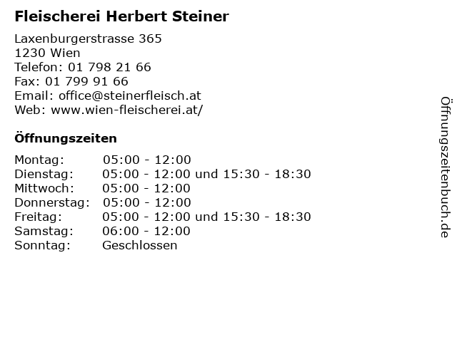 | Öffnungszeiten Fleischerei Herbert Steiner in Wien anzeigen | |