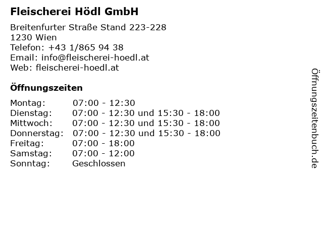 | Öffnungszeiten Fleischerei Hödl GmbH in Wien anzeigen | |
