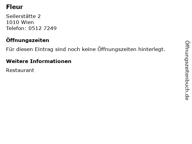 | Öffnungszeiten Fleur in Wien anzeigen | |