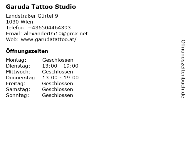 Öffnungszeiten Garuda Tattoo Studio in Wien anzeigen | |