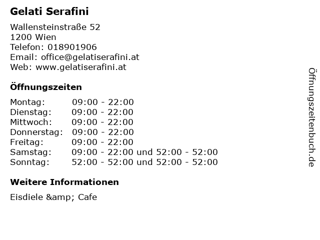 | Öffnungszeiten Gelati Serafini in Wien anzeigen | |